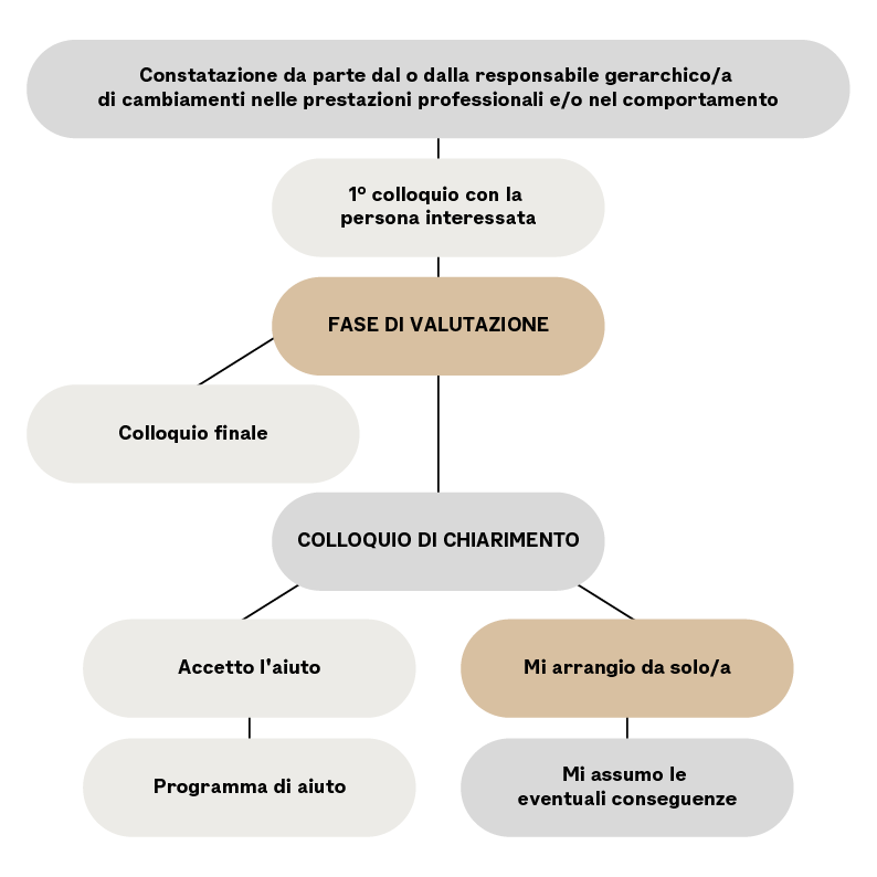 Per poter avviare una procedura di intervento, è necessario aver raccolto fatti e altri indizi ripetuti che indichino cambiamenti sul posto di lavoro. L’intervento non inizia quindi su sospetti di dipendenza, ma sulla base di fatti concreti dei mesi precedenti e di obiettivi.